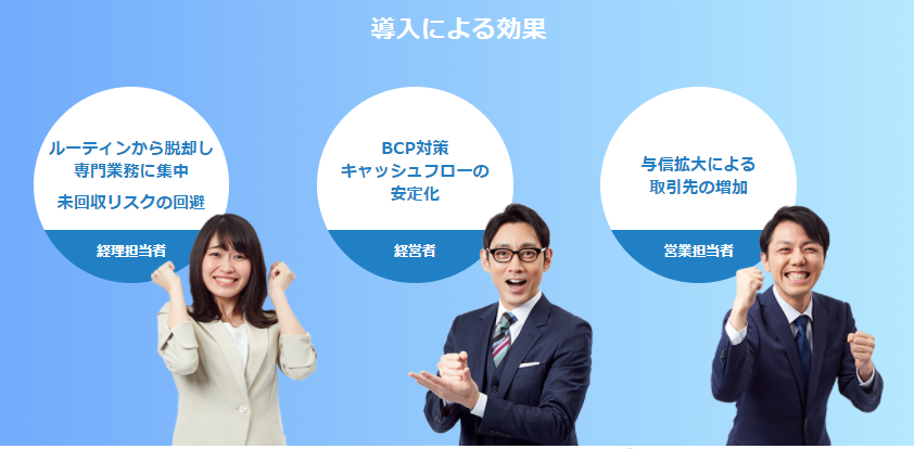 取引先の与信管理、会社ルールによる取引与信ハードルからも解放!高い与信通過率と請求業務の効率化を実現します。万が一、債権の回収ができなくても、リスクを100%保証するので安心。