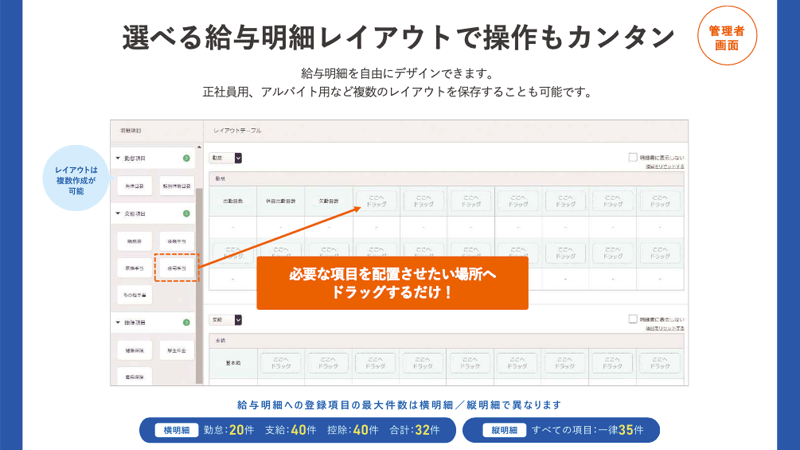 直感的に分かりやすい画面で必要な項目を好きな場所にマウスで配置していくだけの簡単操作です。