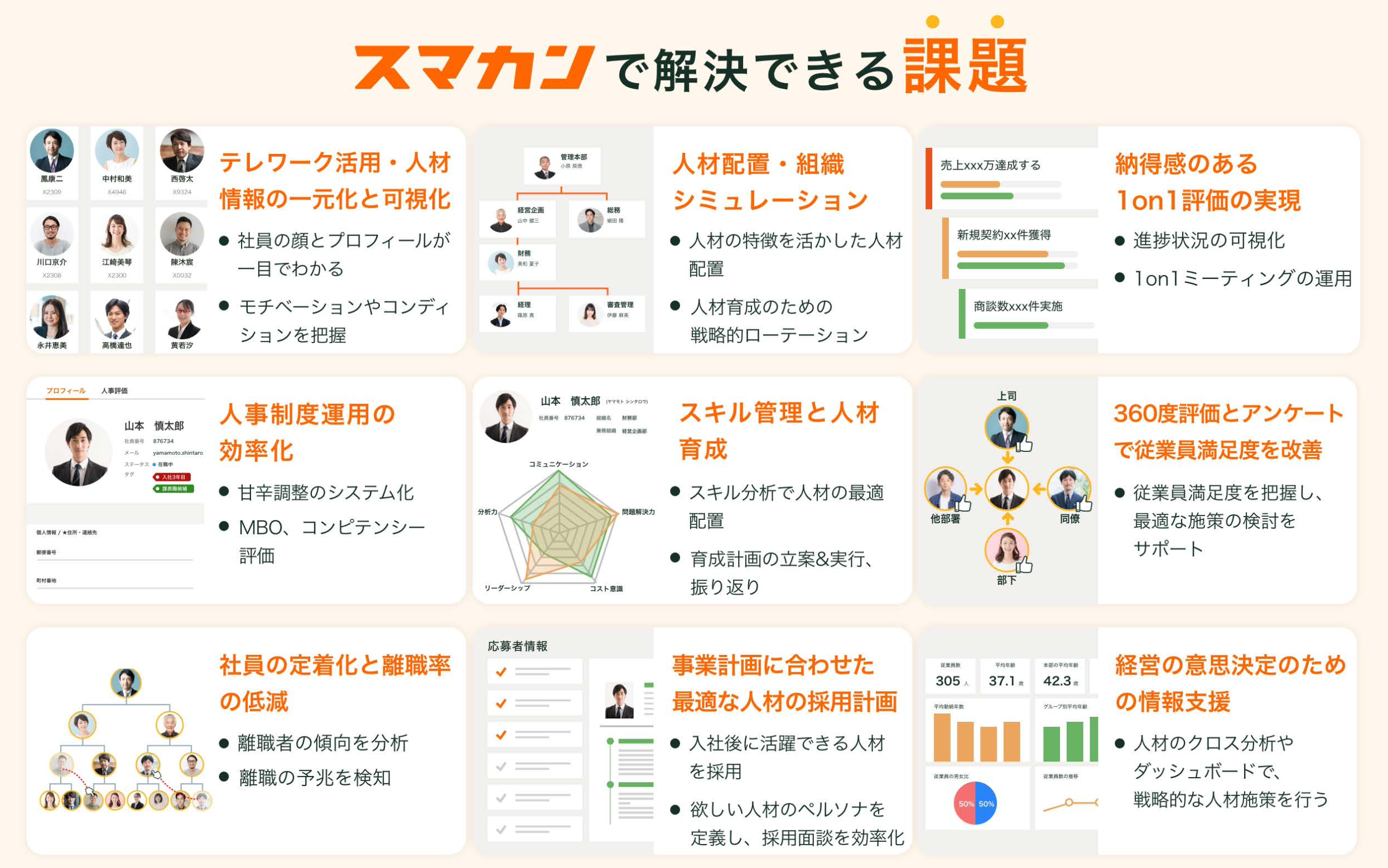 『スマカン』は、1on1と人事評価の効果を最大にし、従業員のエンゲージメントを高めて組織を元気にするタレントマネジメントシステムです。人事評価業務の効率化、人材マネジメント、戦略的な人材配置をご支援いたします。