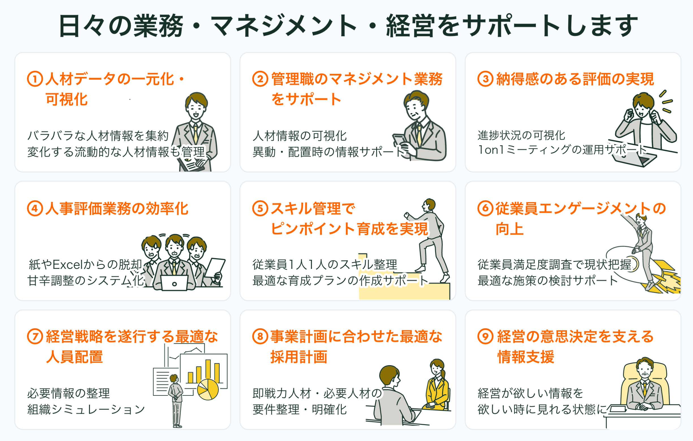 人材データを集約し、膨大な人事業務やマネジメントを効率化。育成・配置・採用など、人事戦略の意思決定を支えます。