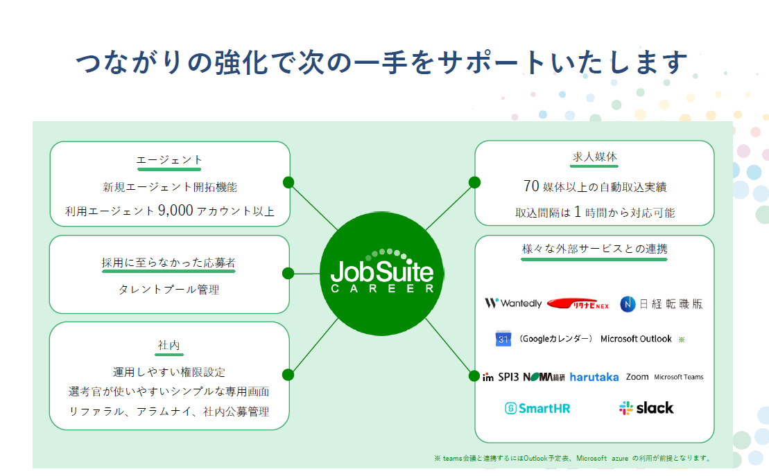 | 連携サービス | Wantedly / リクナビNEXT / 日経キャリアNet / インタビューメーカー / SPI3 / SCOA総合適性検査 / HARUTAKA / Googleカレンダー / Outlookカレンダー / Teams / Zoom / SmartHR / |