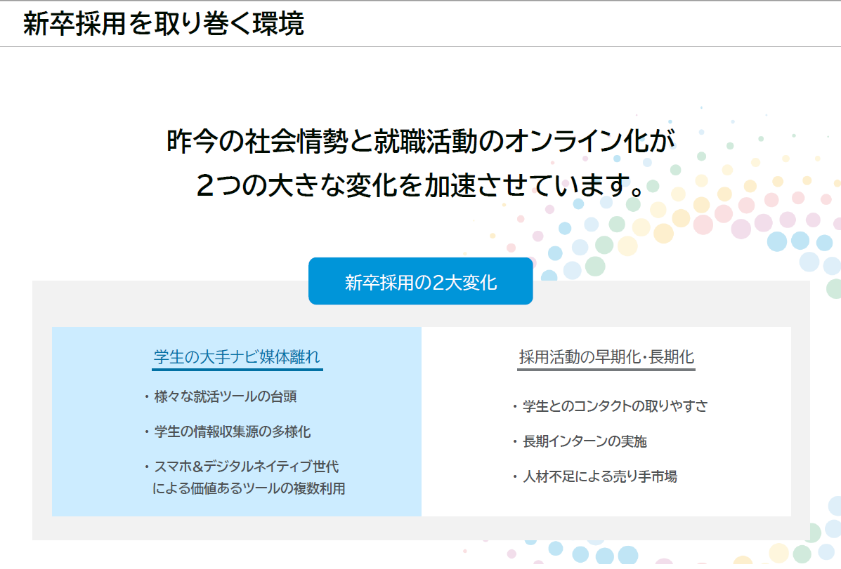 新卒採用にはさまざまなリレーション(つながり)が重要です。インターンにも本選考にも使える「ジョブスイート フレッシャーズ」なら、その「つながり」を実現できます。