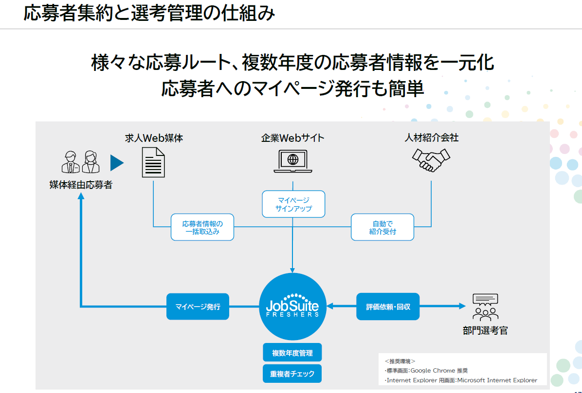 「ジョブスイート フレッシャーズ」は、新卒採用の特徴を踏まえ、運用に必要な機能をどなたでも簡単にお使いいただけるシンプルな設計でご提供いたします。