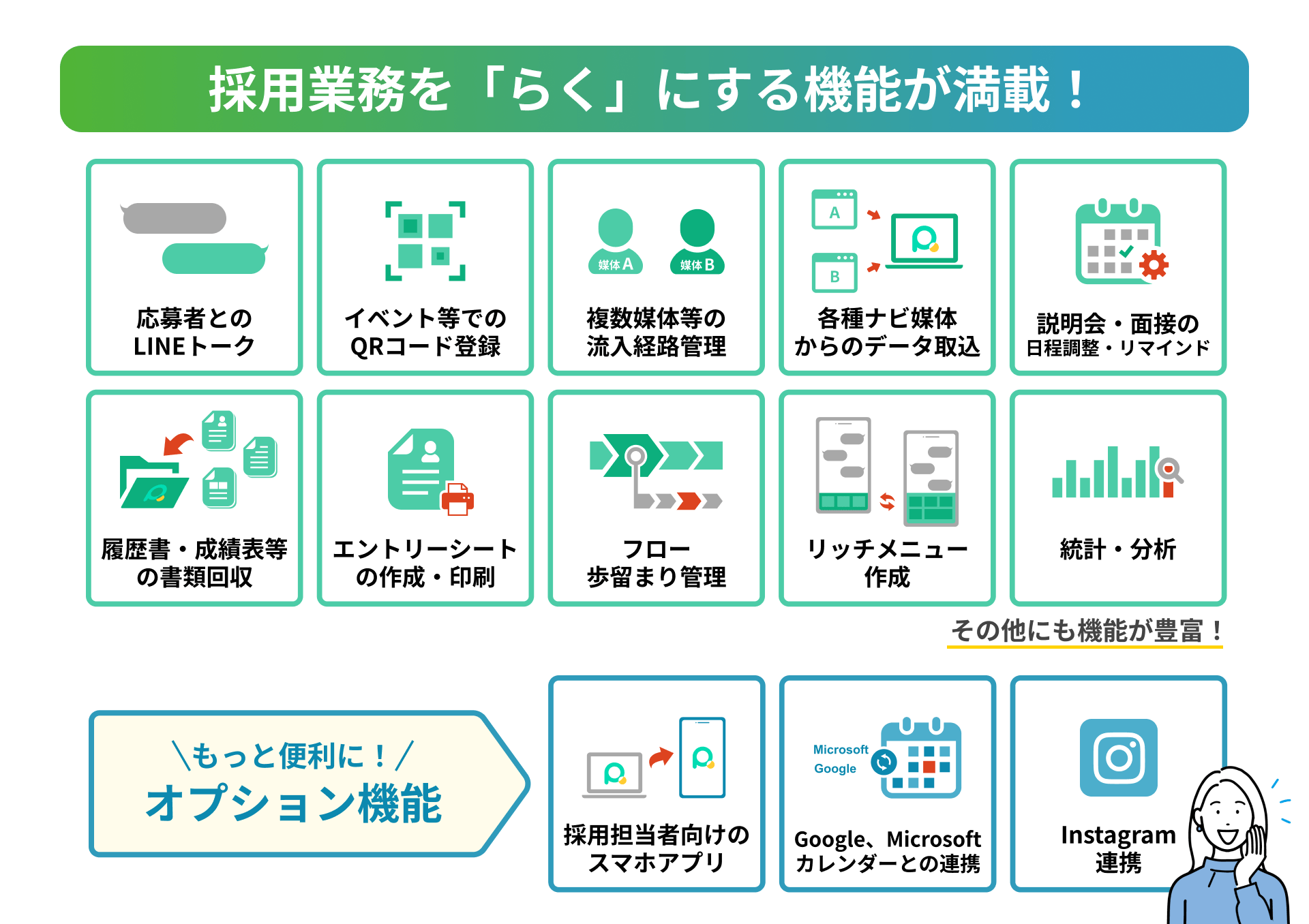 ・応募者管理や提出データの集約管理、日程調整・リマインド、流入経路把握や統計・分析といった機能を標準搭載。
