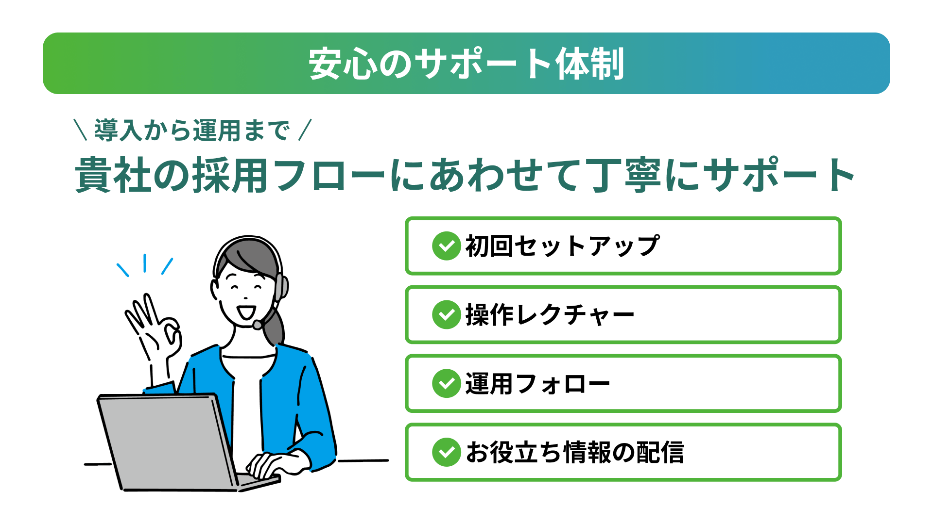 初めて採用管理システムやLINEを利用する場合でも、サポートチームが導入・運用を全面的に支援。