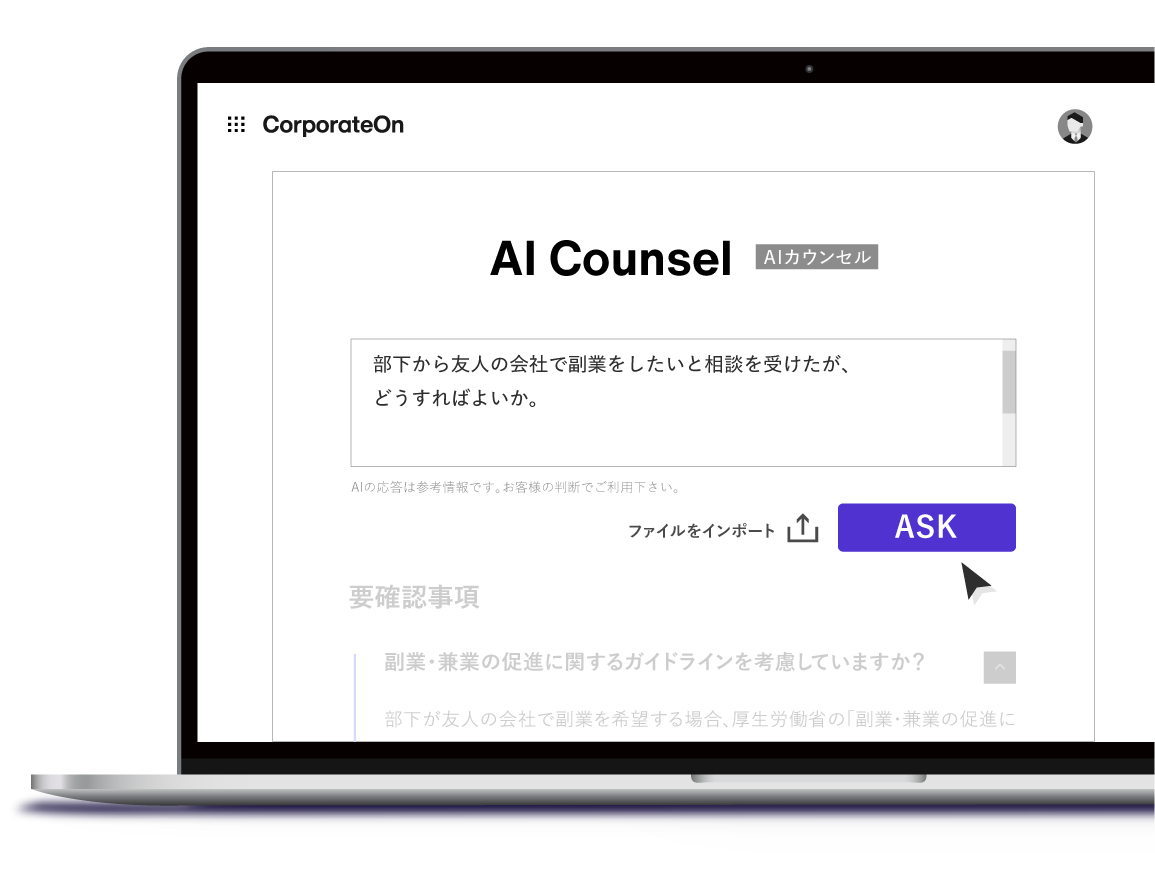 AIカウンセル『CorporateOn』が一次対応することで、事業部門の生産性向上とコンプライアンスやガバナンス強化を両立することができます。