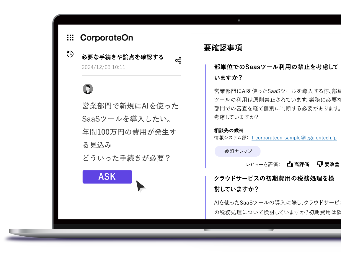 3.【Ask機能】経費精算や稟議などの日常プロセスから経営レベルの局面までワンクリックするだけで迷わず"解"へ導く