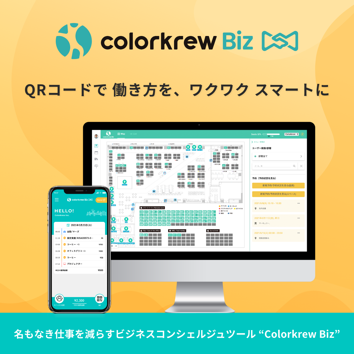 座席やスペース(会議室など)のQRコードを読み取るだけで席の予約から従業員のいる場所の可視化までできます。