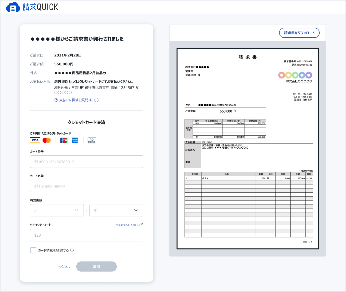 請求QUICKからクレカ決済できる請求書を簡単にメールで送ることができます。