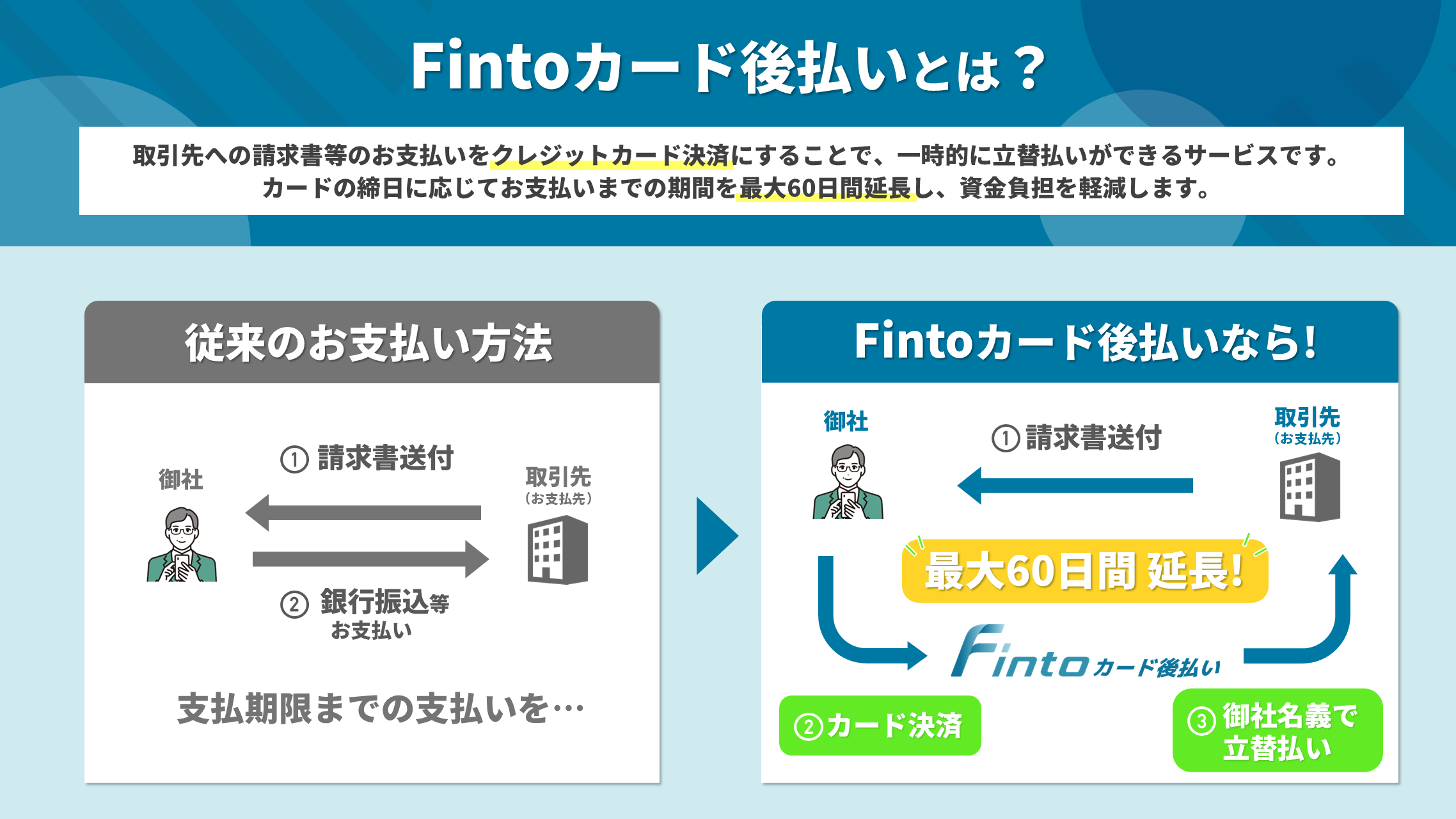 Fintoカード後払いは請求書などの各種お支払いを、弊社サービスを通してクレジットカード決済することで、