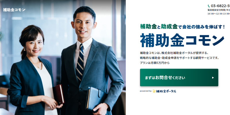 「補助金コモン」は、戦略的な補助金・助成金申請をサポートする顧問サービスです。プランは月額5万円から。年間における設備投資・採用コストを最大90%削減し、貴社の強みの最大化に貢献します。