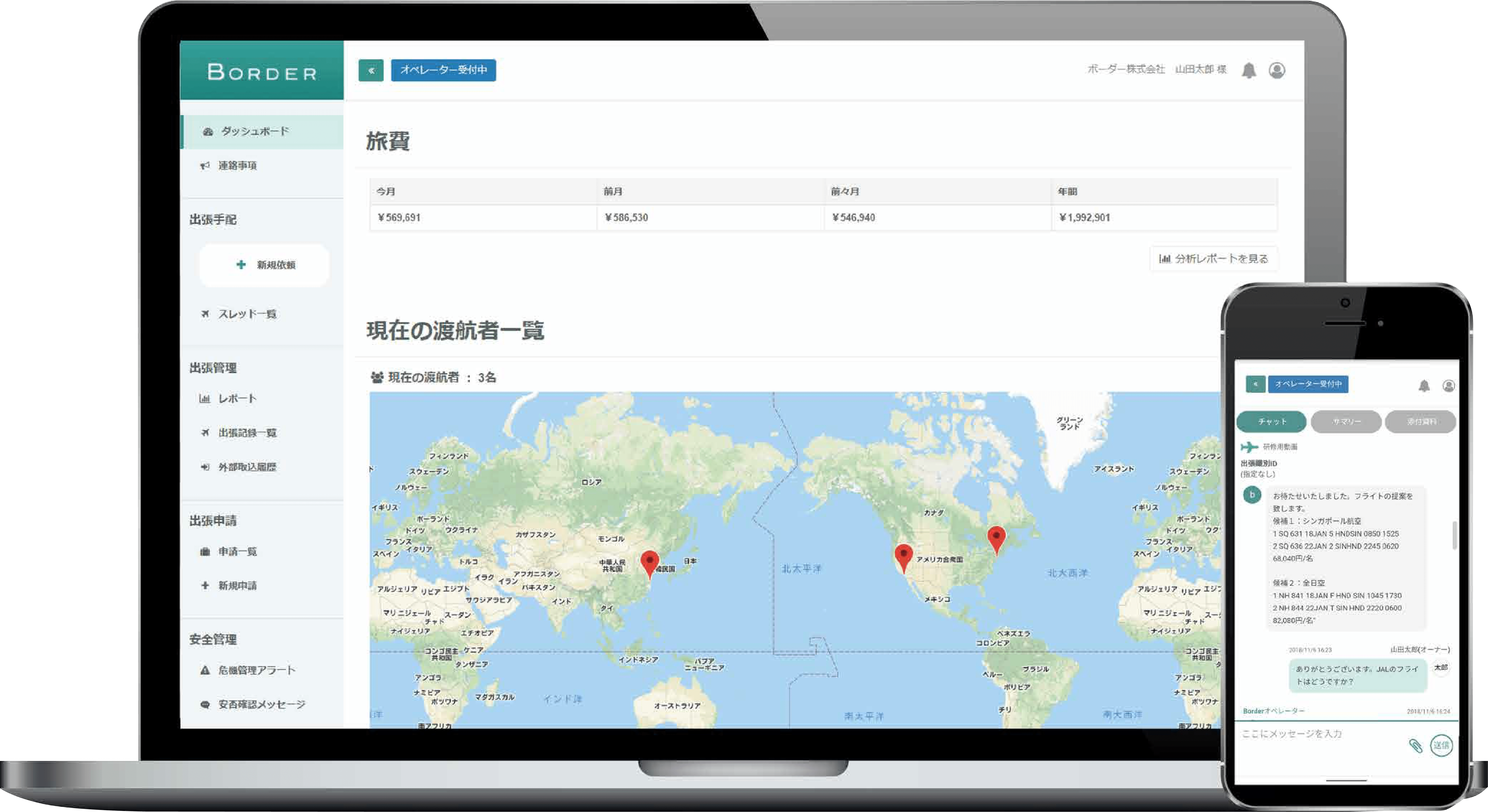 「BORDER」は、海外・国内出張の情報の一元管理を可能にするクラウドBTM(出張管理)です。チャットでスピーディーにフライトやホテルを手配。出張管理における大幅な業務効率化・コスト削減を実現します。