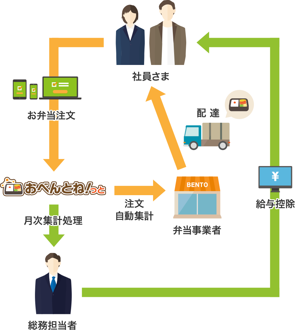 クレジットカートに対応しており、注文・決済は個人で行えるため、注文数の取りまとめや現金回収・給与天引き業務をする必要はございません。※所属する従業員様の注文実績データの抽出により、現金回収・給与天引きに対応することも可能です。