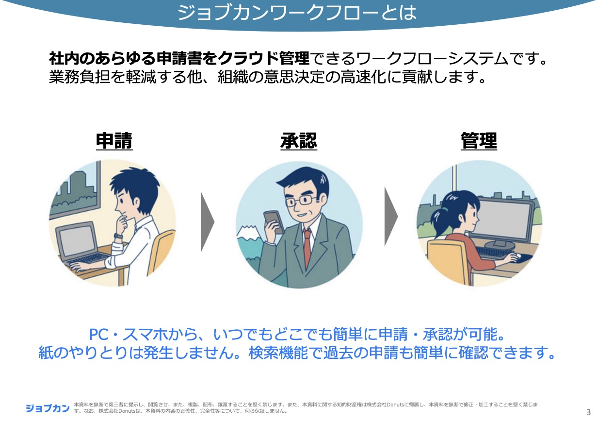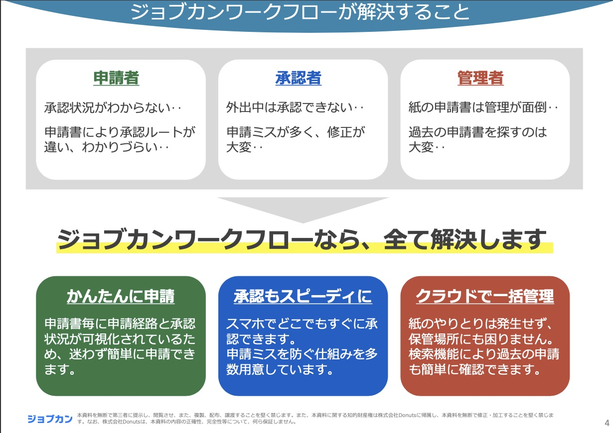 ワークフロー がペーパーレスに行える、ジョブカンワークフロー の機能、料金、特徴等をまとめてご確認いただける資料です。