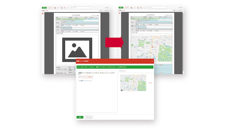 社内の様々な書類を紙イメージのまま電⼦化できます。 高精細な機能をもつフォームエディタで、紙と同じデザインを行うことができます。 また 、紙 運 用 で 使 用して い たExcelやWord、PDFの申請フォームを取り込んでフォームに変換できます。