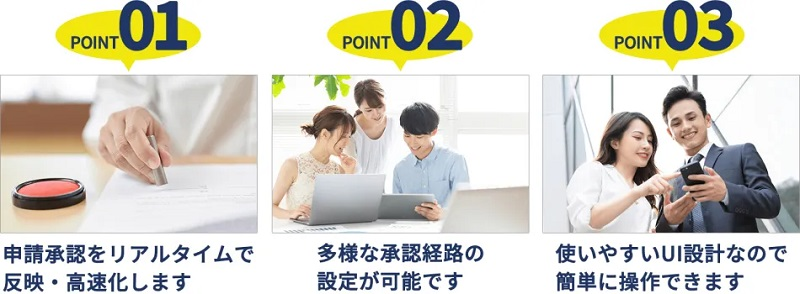 | 機能・仕様 | 各種申請・承認 / 公開設定 / 承認ルート設定 / アラート機能 / 申請フォームカスタマイズ / レポート出力 / 申請フォーム作成 / スマホ対応 |