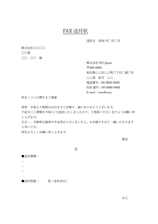 日常的な書類送付はもちろん、見積書や契約書、申請書類などの送付時にもご活用ください。※本テンプレートは一般的なビジネス文書の作成例として作成したものです。